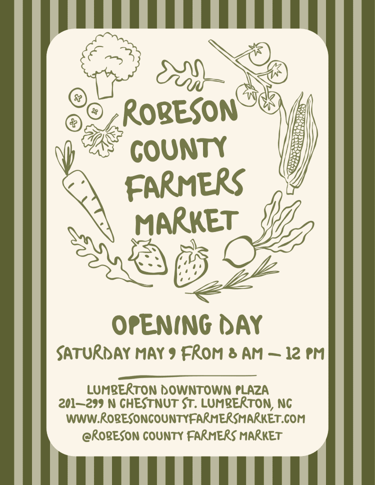 Robeson County Farmers Market Corner of 3rd Street & Water Street, Lumberton, North CarolinaThe 2026 Season of the Robeson County Farmers Market begins! The Market is located downtown on the plaza for opening day. Farmers display the fresh-from-the-field vegetables, eggs, meats and more. […]