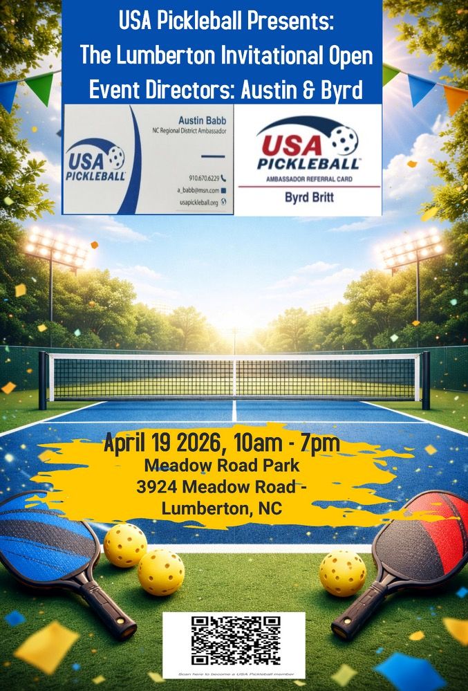Meadow Road Athletic Park 3924 Meadow Road, Lumberton, North CarolinaUSA Pickleball presents the Lumberton Invitational Open. The event is being played at Meadow Road Park, 3924 Meadow Road, Lumberton, NC 28358. Follow instructions for registration by using the QR […]