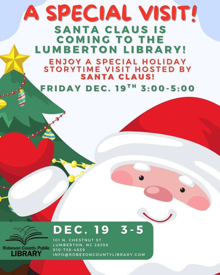 Robeson County Public Library 301 North Chestnut Street, Lumberton, North CarolinaSanta is at the Robeson County Public Library from 3-5pm! Christmas is very near! He's there at STORYTIME! Join him during this special time.