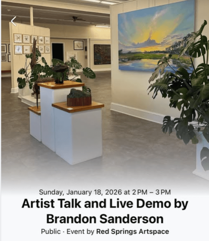 Red Springs Artspace 200 South Main Street, Red Springs, North CarolinaRed Springs Art Space is hosting "Artist Talk and Live Demo" by Brandon Sanderson. Enjoy an afternoon at the art gallery and listen and learn from Brandon Sanderson.