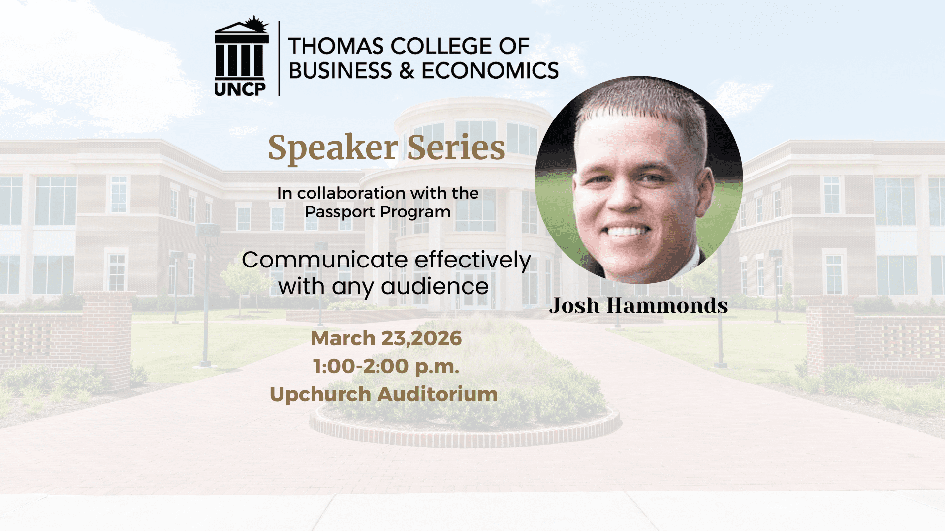 Thomas School of Business Auditorium (UNCP campus) 1 University Drive, Pembroke, North CarolinaThe Thomas College of Business & Economics is hosting Josh Hammonds. Mr. Hammonds is speaking in collaboration with the Passport Program; on Communicate Effectively With Any Audience. Students are encouraged […]