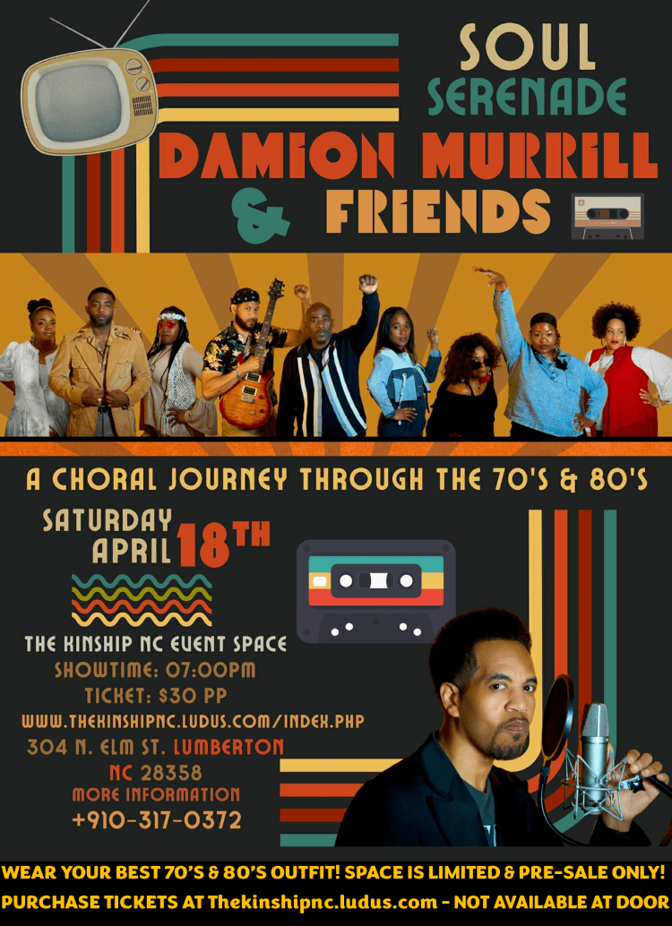 The Kinship NC 304 North Elm Street, Lumberton, North CarolinaTake a choral journey through the 70's and 80's with Damion Murrill & Friends. Wear your best 70's and 80's outfit to the event. Space is limited and pre-sale tickets […]