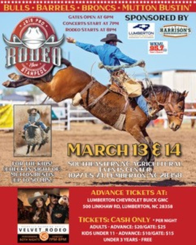 Southeastern North Carolina Agricultural Events Center 1027 Hwy 74 East, Lumberton, NC, United StatesJ. R.'s Pro Rodeo Stampede is back at the Southeastern NC Agricultural Event Center for two days. Gates open at 6:00pm, the music starts at 7:00pm and the show starts at 8:00pm. Enjoy an action packed evening at the rodeo. Advanced tickets may be purchased in person at the Lumberton Chevrolet Buick GMC dealership or […]