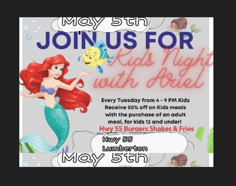 Hwy 55 2402 N. Roberts Ave, Lumberton, North CarolinaEvery Tuesday night from 4-9pm, kids receive 50% off on kid's meals with the purchase of an adult meal, for kids 12 years and under. Tuesday night, May 5th, visit with Ariel, from the Disney movie The Little Mermaid. Order and enjoy delicious food from the menu along with a creamy, thick shake.