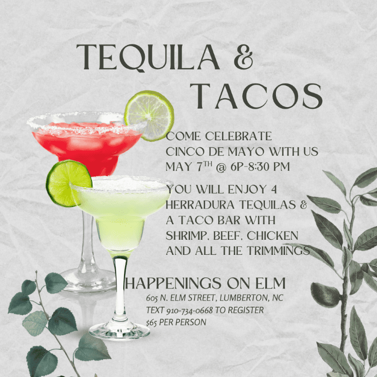 Happenings on Elm 605 North Elm Street, Lumberton, North CarolinaYou are invited to a Tequila & Taco special evening at Happenings on Elm! You'll enjoy Tequilas, a taco bar with shrimp, beef, chicken and all the trimmings. Celebrate Cinco […]