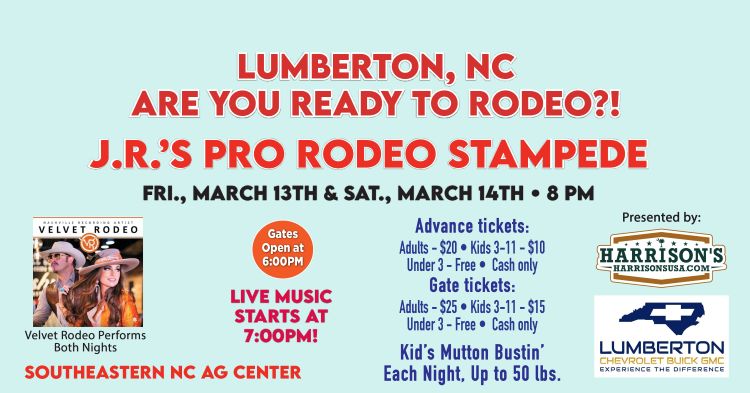 Southeastern North Carolina Agricultural Events Center 1027 Hwy 74 East, Lumberton, NC, United StatesJ. R.'s Pro Rodeo Stampede is back at the Southeastern NC Agricultural Event Center for two days. Gates open at 6:00pm, the music starts at 7:00pm and the show starts at 8:00pm. Enjoy an action packed evening at the rodeo. Advanced tickets may be purchased in person at the Lumberton Chevrolet Buick GMC dealership or […]