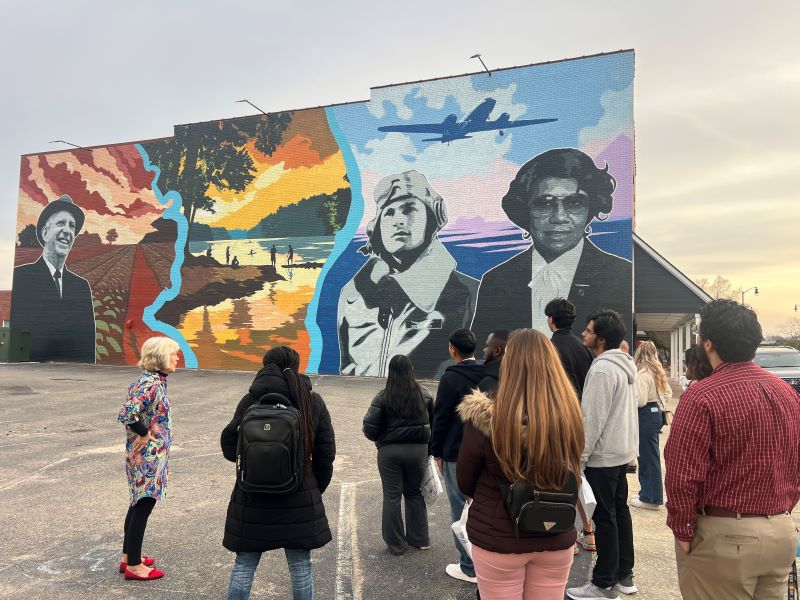 Exchange Students attending UNC at Pembroke observe the Legacy mural recently painted by Max Dowdle and 80 local volunteers. The mural touches the rich history of Lumberton and Robeson County.