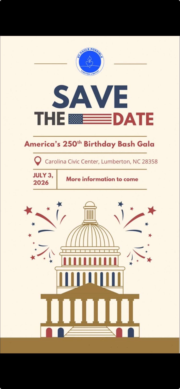 Carolina Civic Center Historic Theater 315 North Chestnut Street, Lumberton, NC, United StatesSAVE THE DATE!!! The Carolina Civic Center is hosting a mega birthday bash, celebrating the birthday of our great nation's 250th year. Details are in the making, so SAVE THE DATE!! Correct times of events will be announced later.