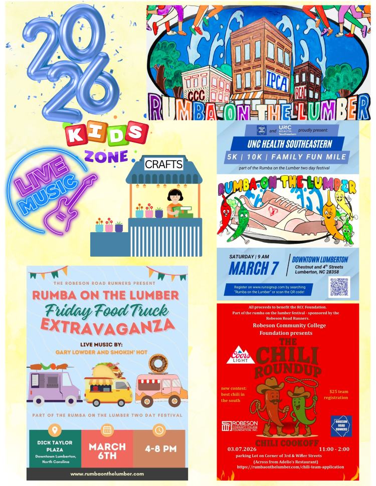 Dick Taylor Plaza (Historic Downtown) 111 E 3rd Street, Lumberton, NC, United StatesPlan for a family weekend in Lumberton! The Rumba on the Lumber is celebrating with a 5K, 10K, Family Fun Mile, vendors, kids games, art, bands, chili cookoff, beer garden, food trucks and many other action activities. Times of events to be announced soon.